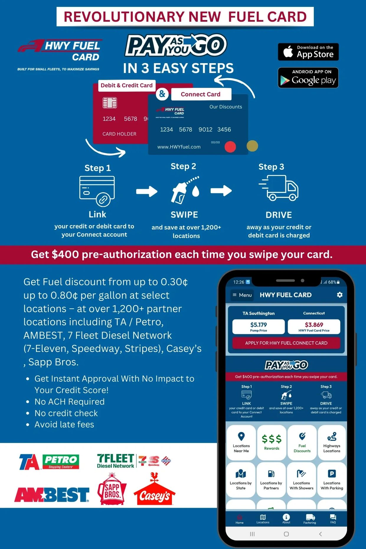 Disclaimer: The HWY FUEL CARD mobile app provides a simple and convenient way to find fuel Locations with Pump Price vs Discount Price updated daily. Discount prices vary from location to location. This is a screenshot example, please verify the prices by downloading the app. These prices change from day to day, and we do not guarantee these prices.